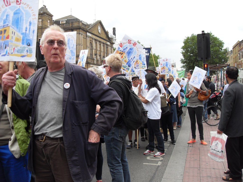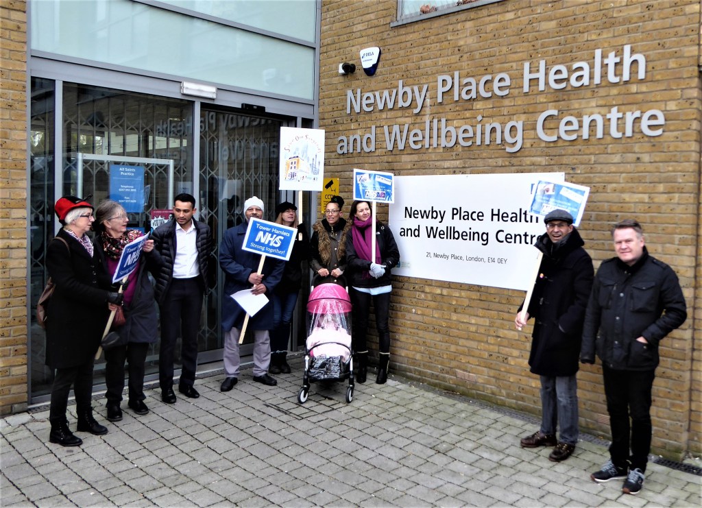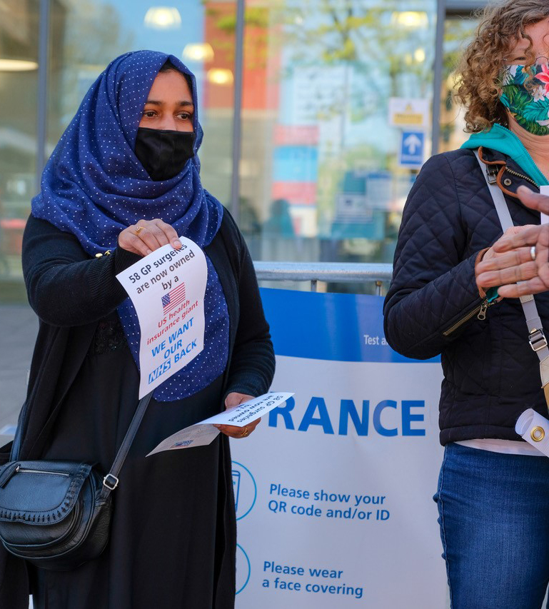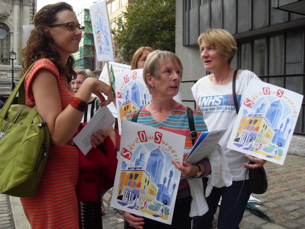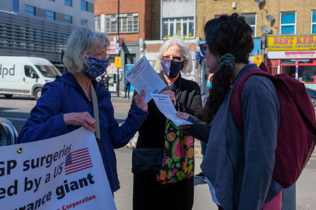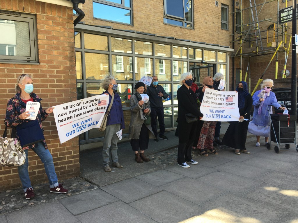 Protesting against the corporate takeover of four Tower Hamlets GP surgeries by Operose Health (a UK subsidiary of the US health giant, the Centene Corporation)